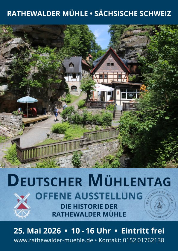 Großen Ruf erlangte die Mühle um 1900 durch das reichhaltige und vorzügliche Kuchenangebot unter dem Namen “Kaffeeschank” . Etliche historische Postkarten geben das Flair vergangener Jahre wieder. Der Zahn der Zeit hat den Verfall der ältesten Mühle der Sächsischen Schweiz weit vorangetrieben. Wir Brüder sind aber dabei, das Flair vergangener Jahre stückchenweise wieder in der Rathewalder Mühle einziehen zu lassen.